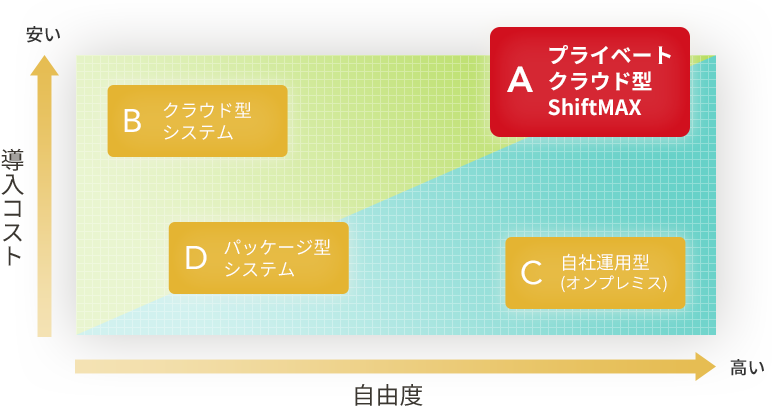シフトマックスは、簡単導入&低価格のクラウド型と、自由度が高い自社運用型(オンプレミス)の長所をミックスした「プライベートクラウド型」勤怠管理システムです。